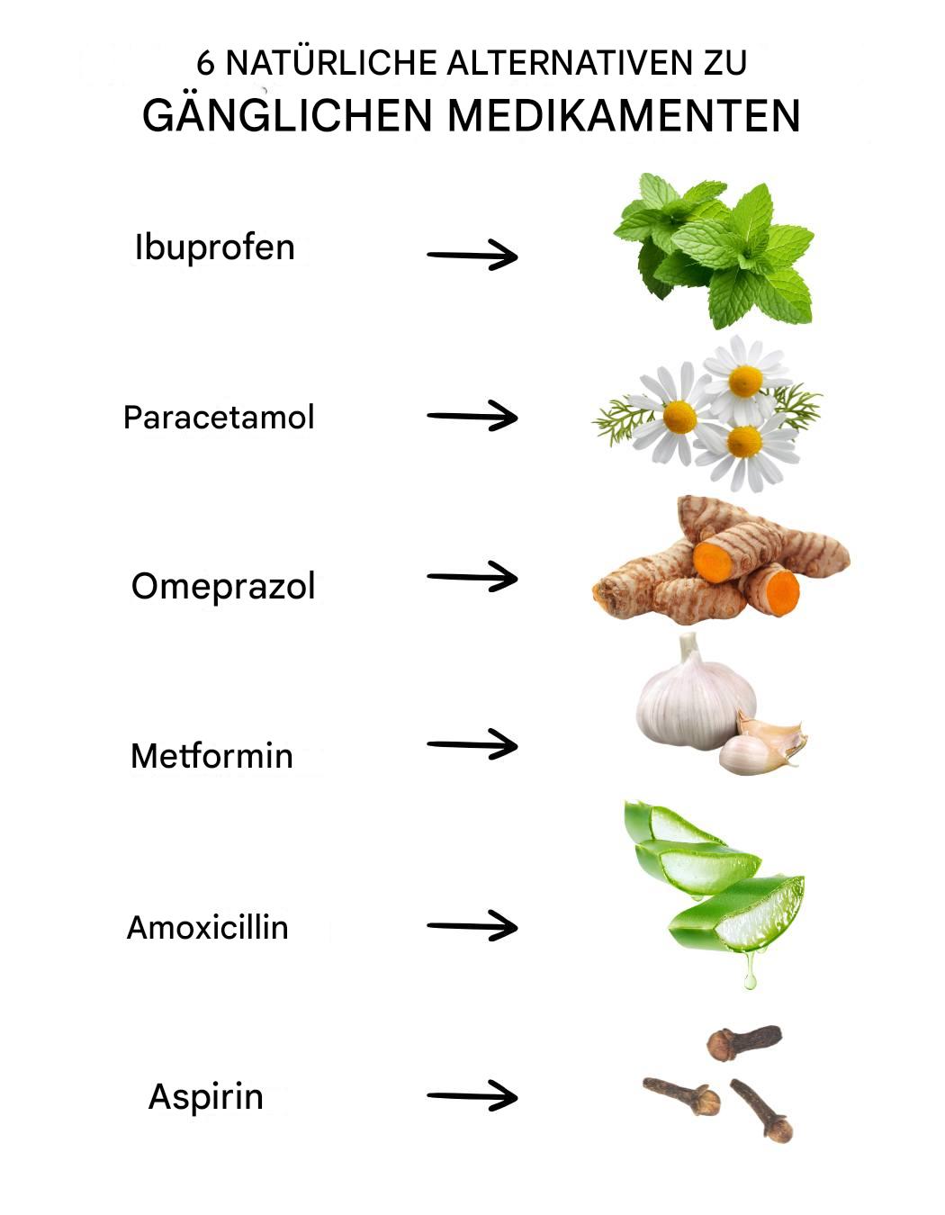6 natürliche Alternativen zu gängigen Medikamenten •  Ibuprofen  Pfefferminzelindert Schmerzen und Entzündungen bei: Kopfschmerzen,Muskelkater•  Paracetamol  Kamilleberuhigt Schmerzen und entspannt den Körper Für: Fieber, Gliederschmerzen, Stress•  Omeprazol  Kurkumareduziert den Säuregehalt und unterstützt die Verdauung Für: Sodbrennen, Blähungen•  Metformin  Knoblauch
