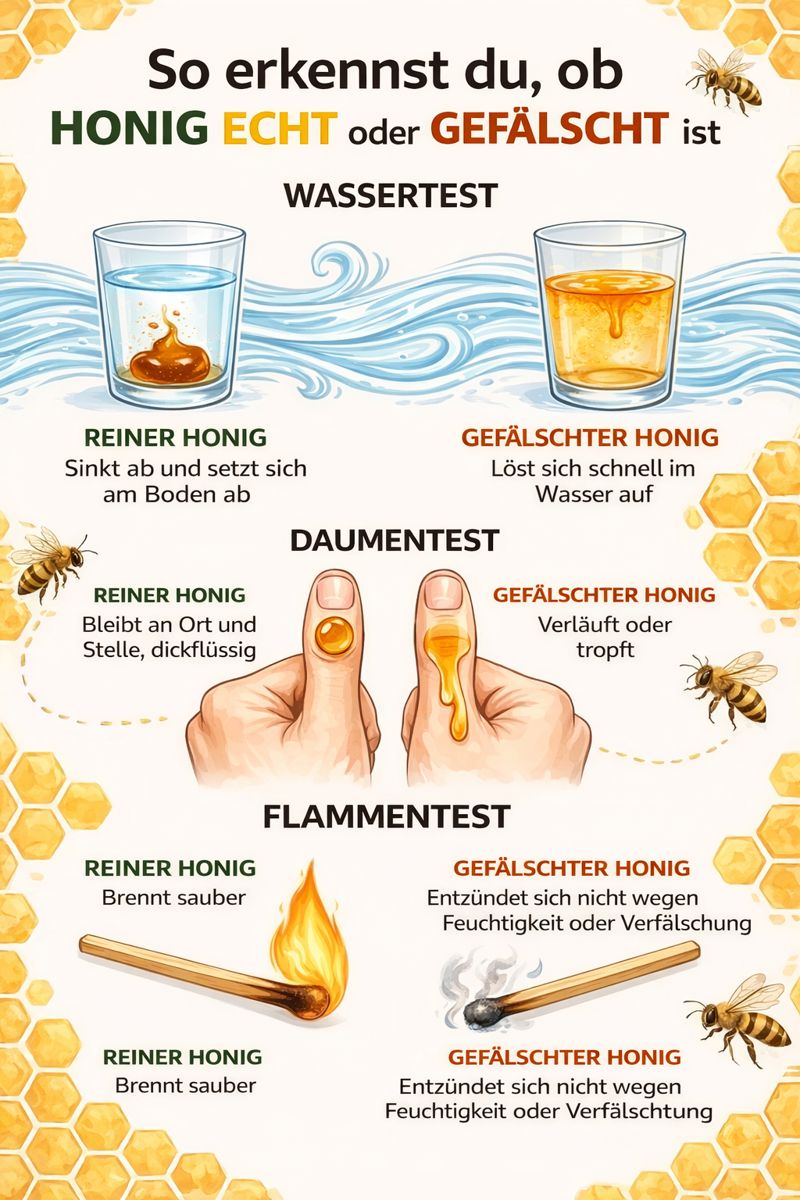 Hinweis: Auch echter Honig kann je nach Temperatur und Kristallisation unterschiedlich reagieren.