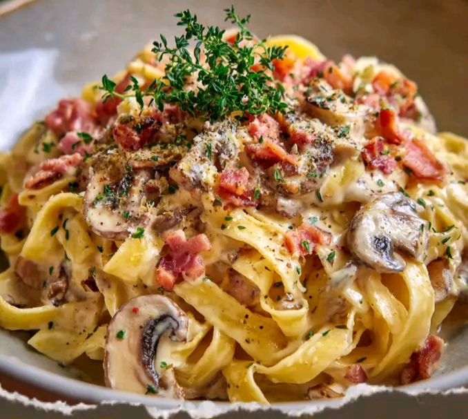 🍝 Tagliatelle mit Sahne, Champignons und knusprigem Pancetta 😋