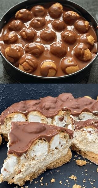 2. Den Tortenboden auf eine Tortenplatte setzen. Den Vanillepudding gleichmäßig auf dem Tortenboden verteilen. Die Windbeutel gefroren und dicht an dicht auf den Pudding stezen.